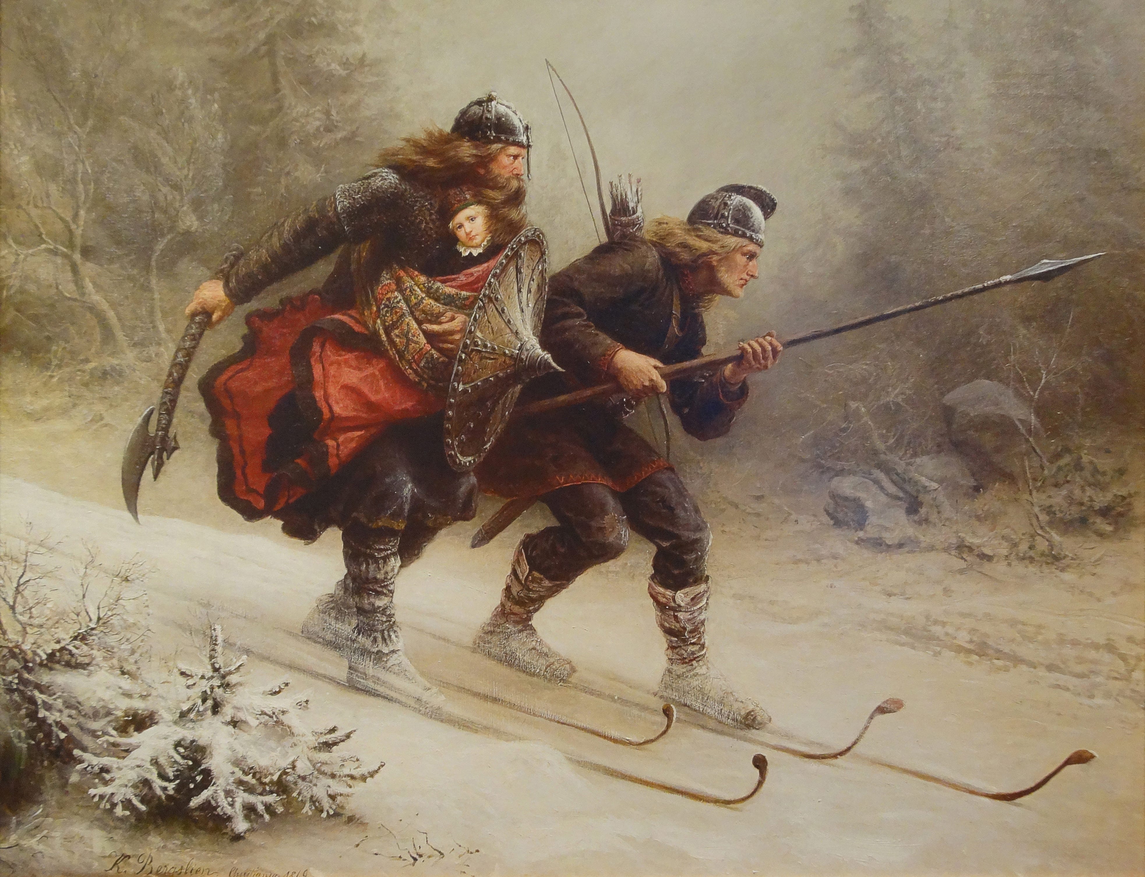 A group of Birkibeinar therefore flees with the boy in the winter of 1205/1206 to save him. Upon being stranded in a blizzard, two of the best Birkibeinar skiers, Torstein Skevla and Skjervald Skrukka, carry the heir to the throne over the mountains, from Lillehammer to Østerdalen, to the safety of King Ingi Bárðarson (Inge Bårdsson).