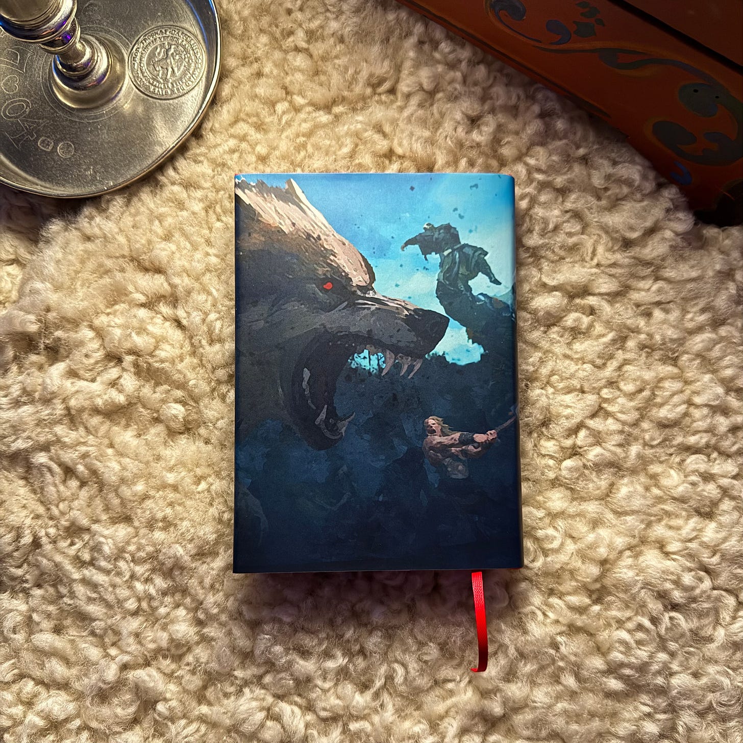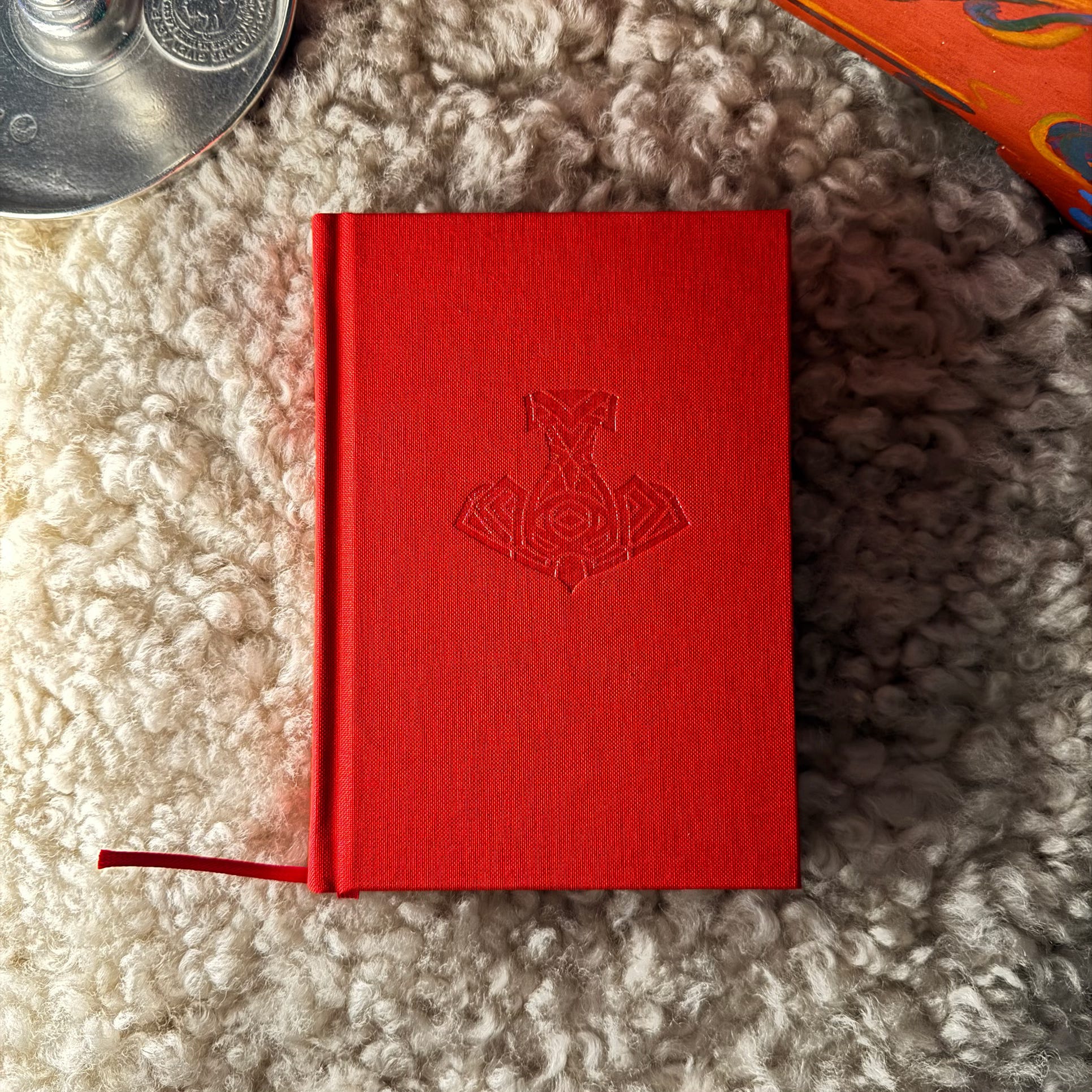 Old Norse with English translation (Diglot). A6 format (105 x 148 mm or 4.1 x 5.8 in). Full color. 182 pages made with paper/trees from Sweden. Handbound in Oslo with red linen hardcover embossed with Mjölnir symbol (also used for the rank of Hirðmaðr/Hersir with Sverðin). Full color book jacket depicting a Norse battle scene. Printed in Norway.