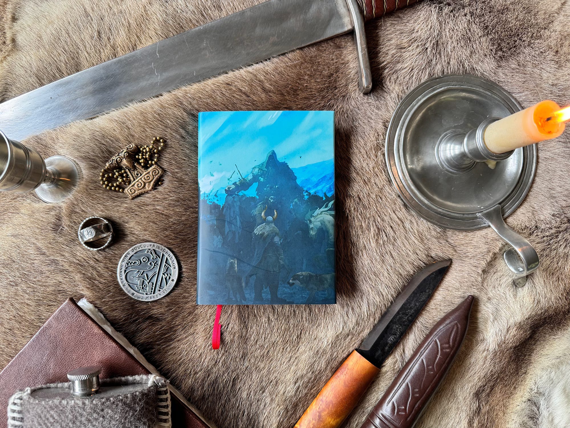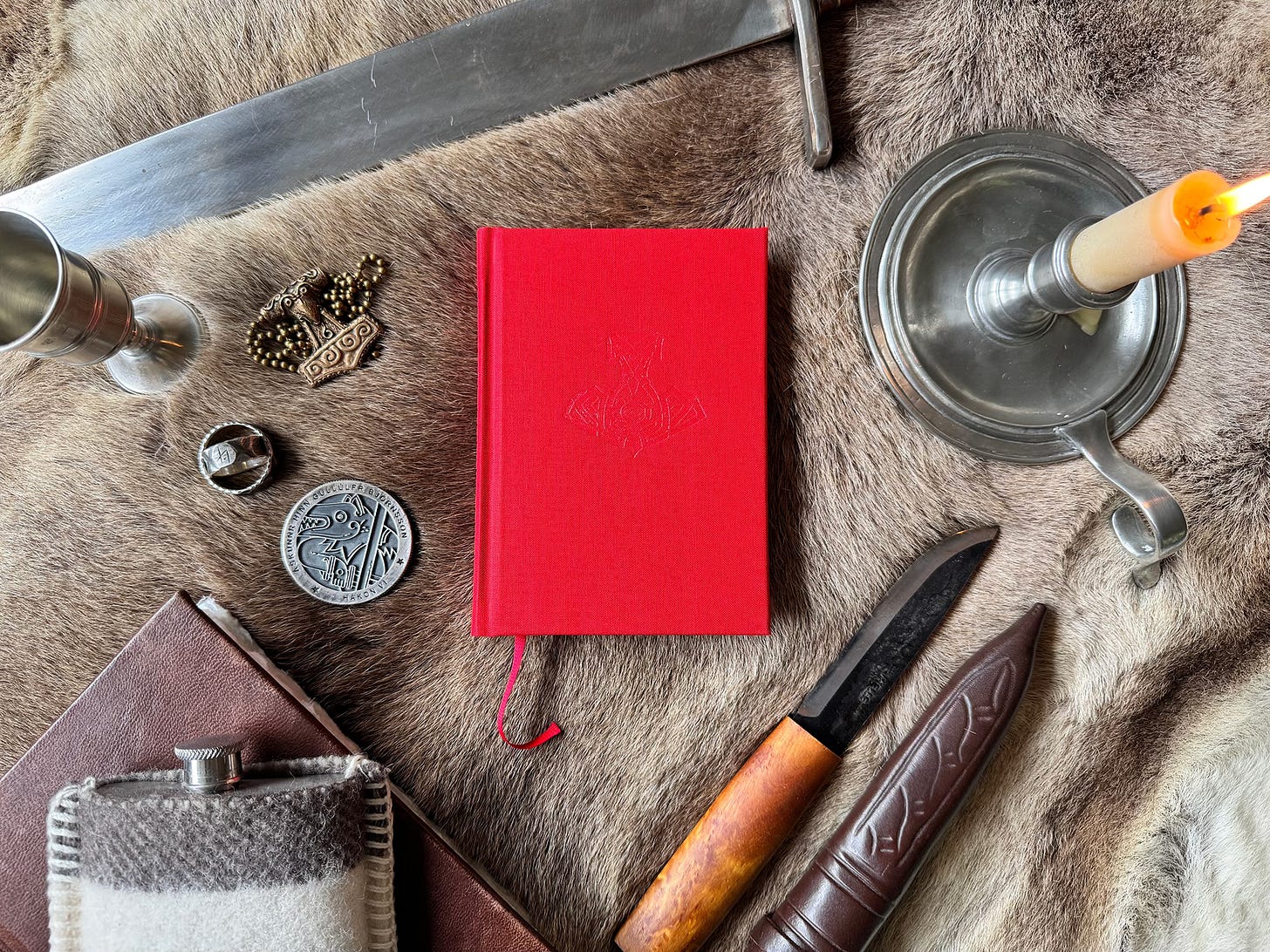 Old Norse with English translation (Diglot). A6 format (105 x 148 mm or 4.1 x 5.8 in). Full color. 182 pages made with paper/trees from Sweden. Handbound in Oslo with red linen hardcover embossed with Mjölnir symbol (also used for the rank of Hirðmaðr/Hersir with Sverðin). Full color book jacket depicting a Norse battle scene. Printed in Norway.