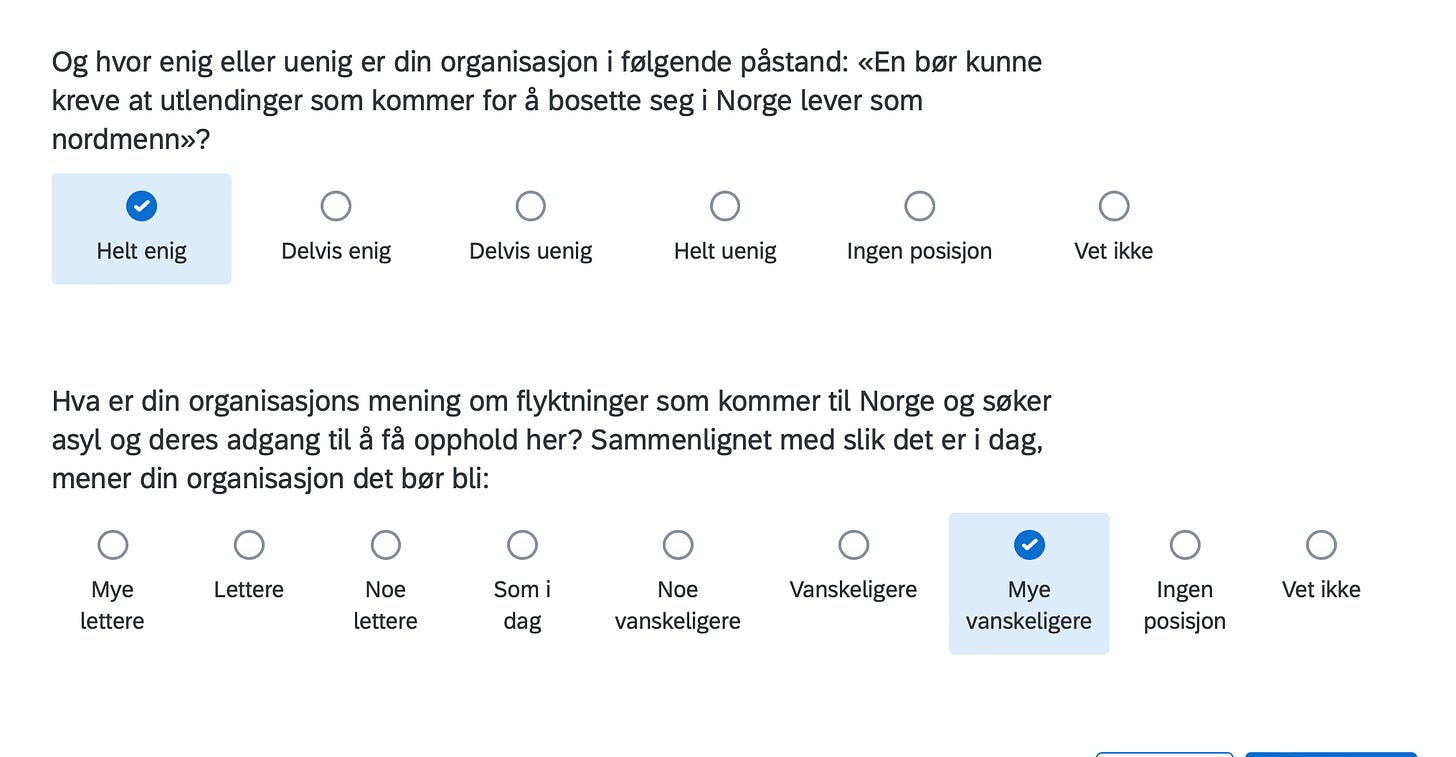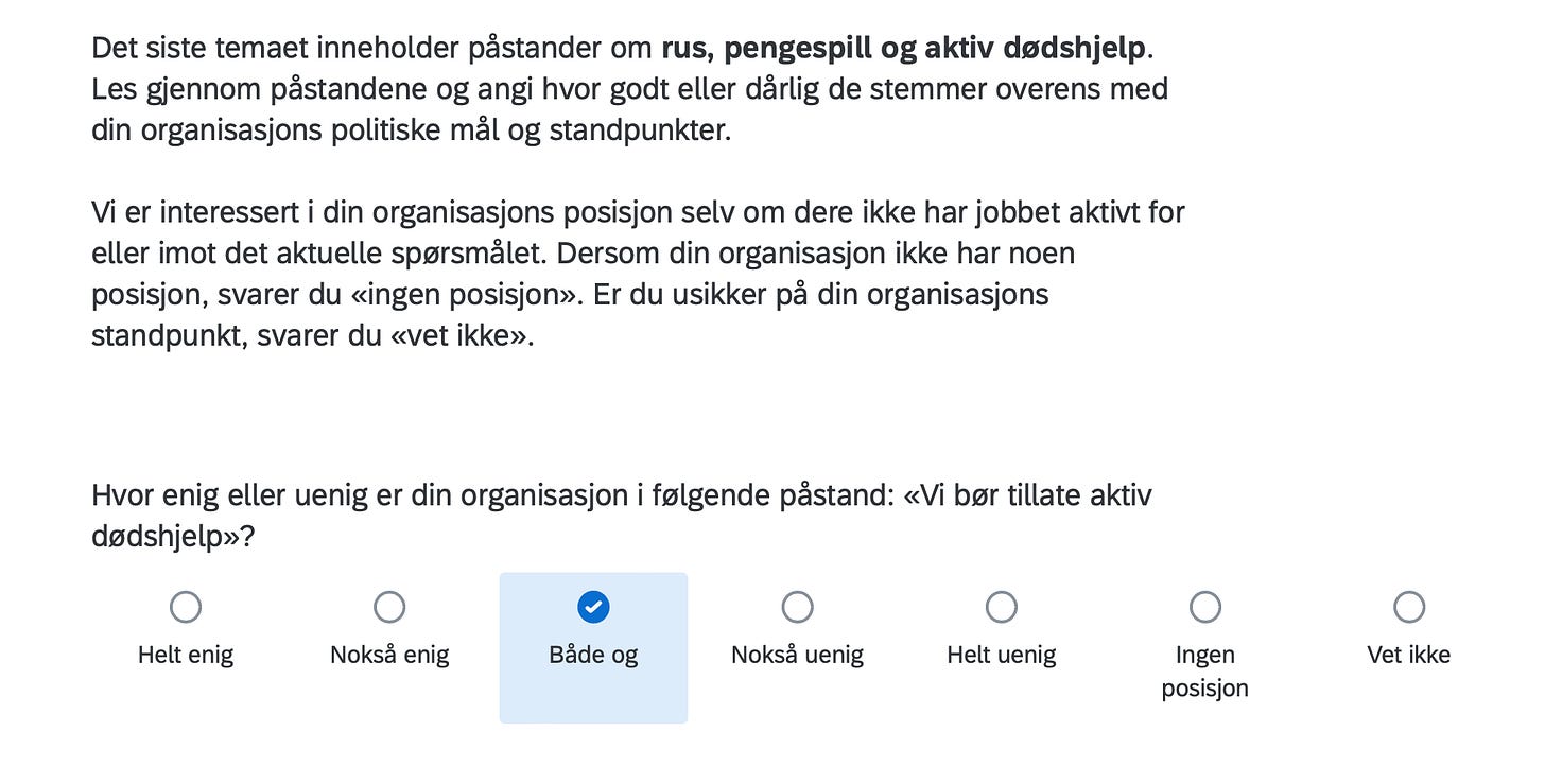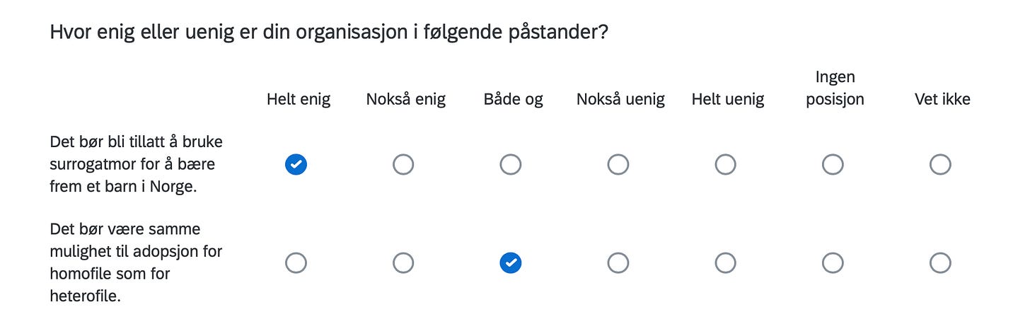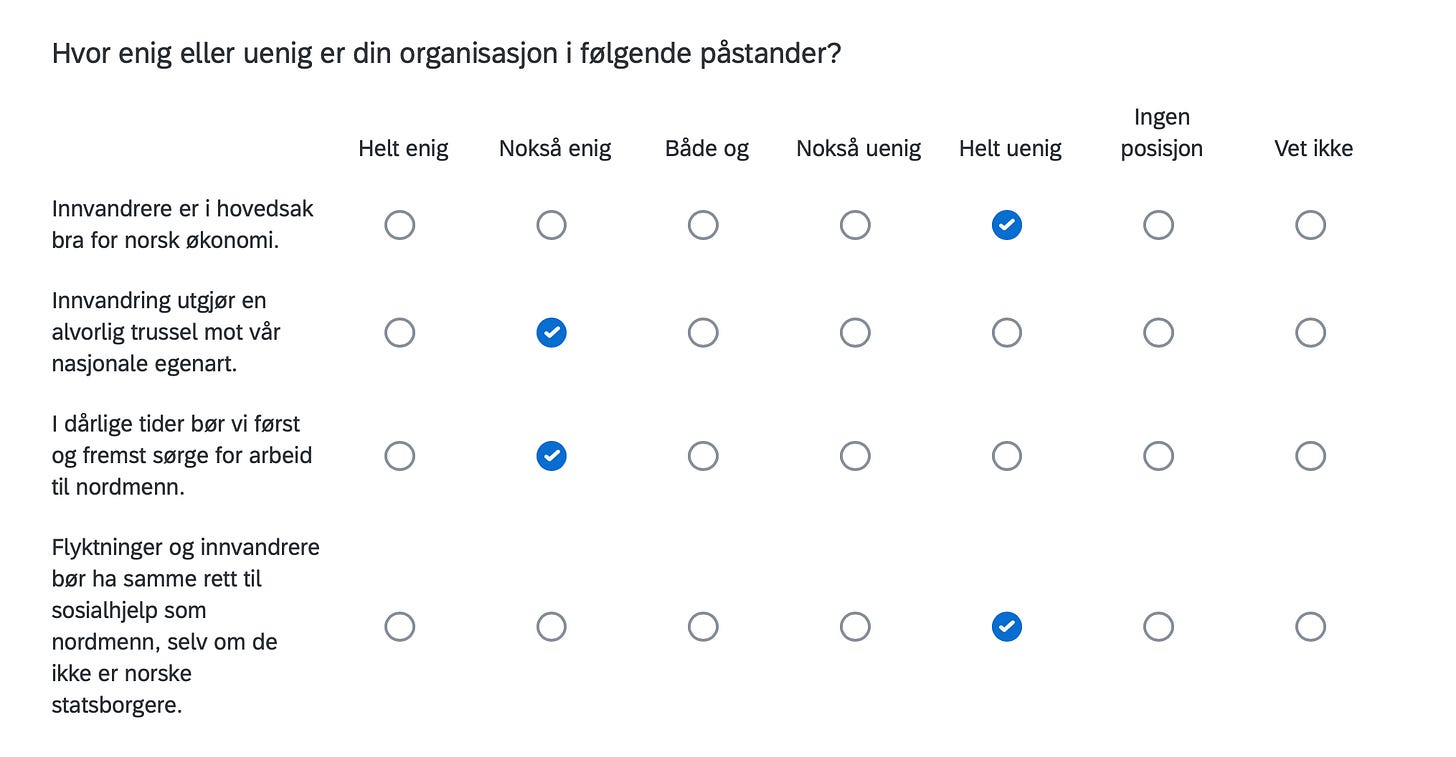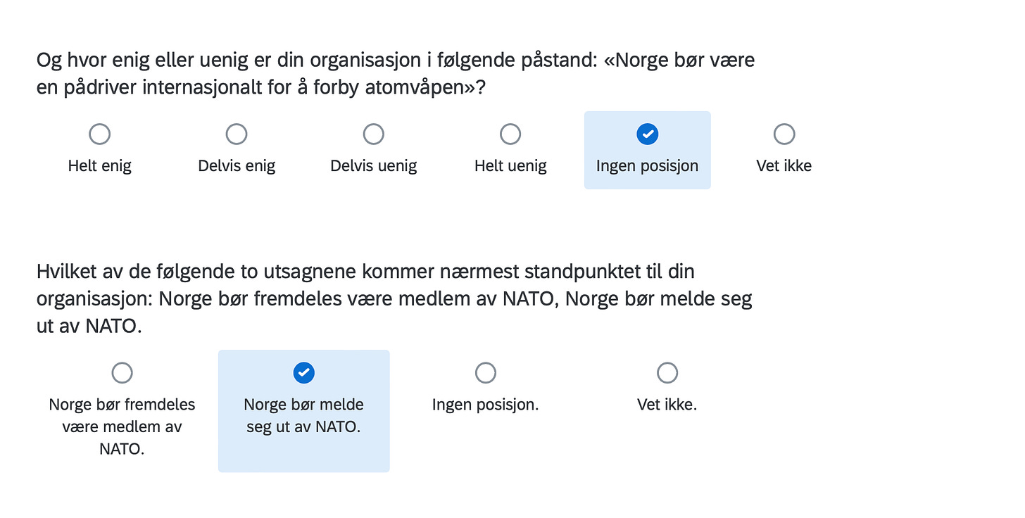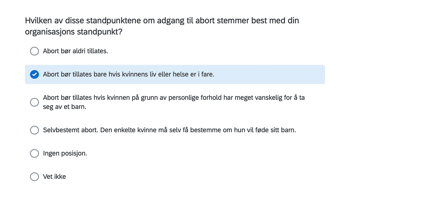 Below are the positions of FORN SIÐR in a Norwegian survey assessing the position of organizations in Norway with respect to current political issues, including controversial matters such as environment, resource extraction, immigration, NATO membership, education, gender equality and even abortion.