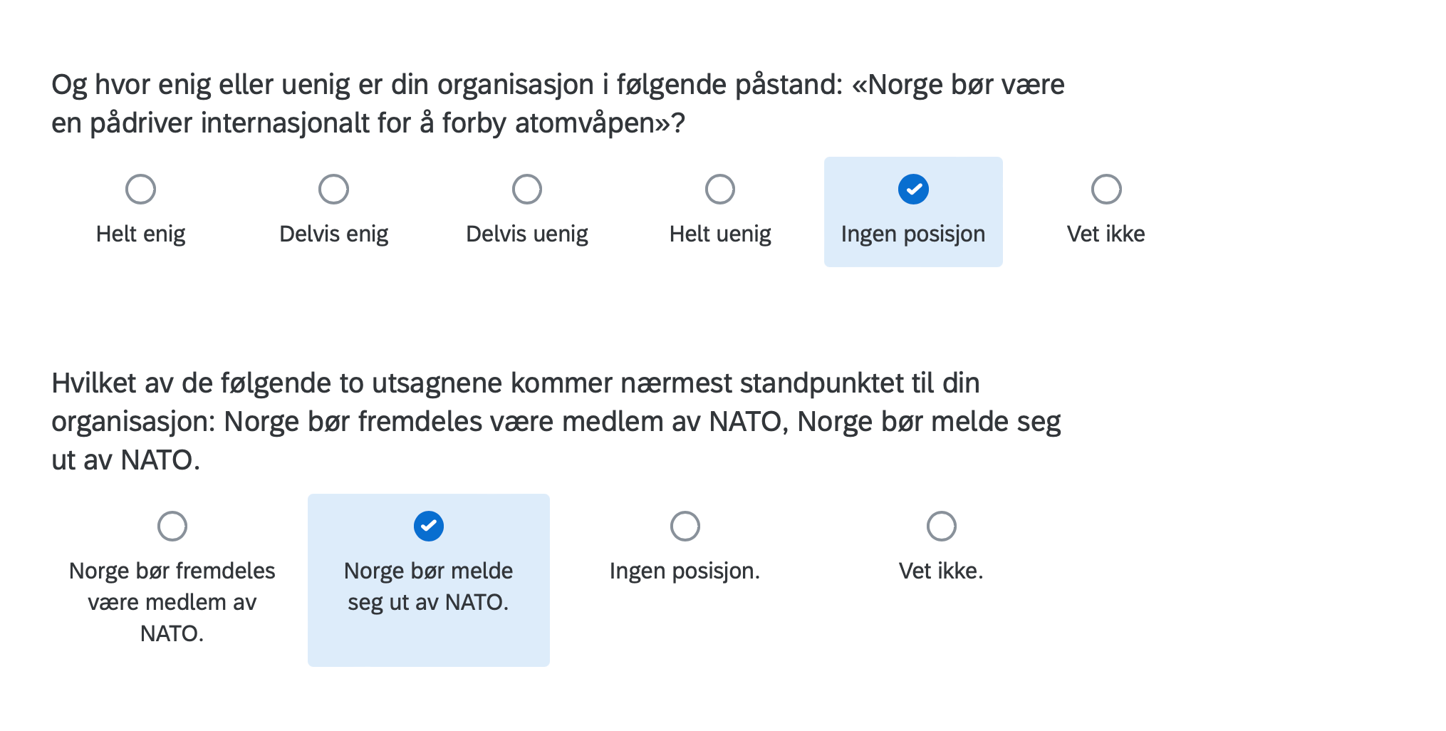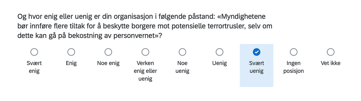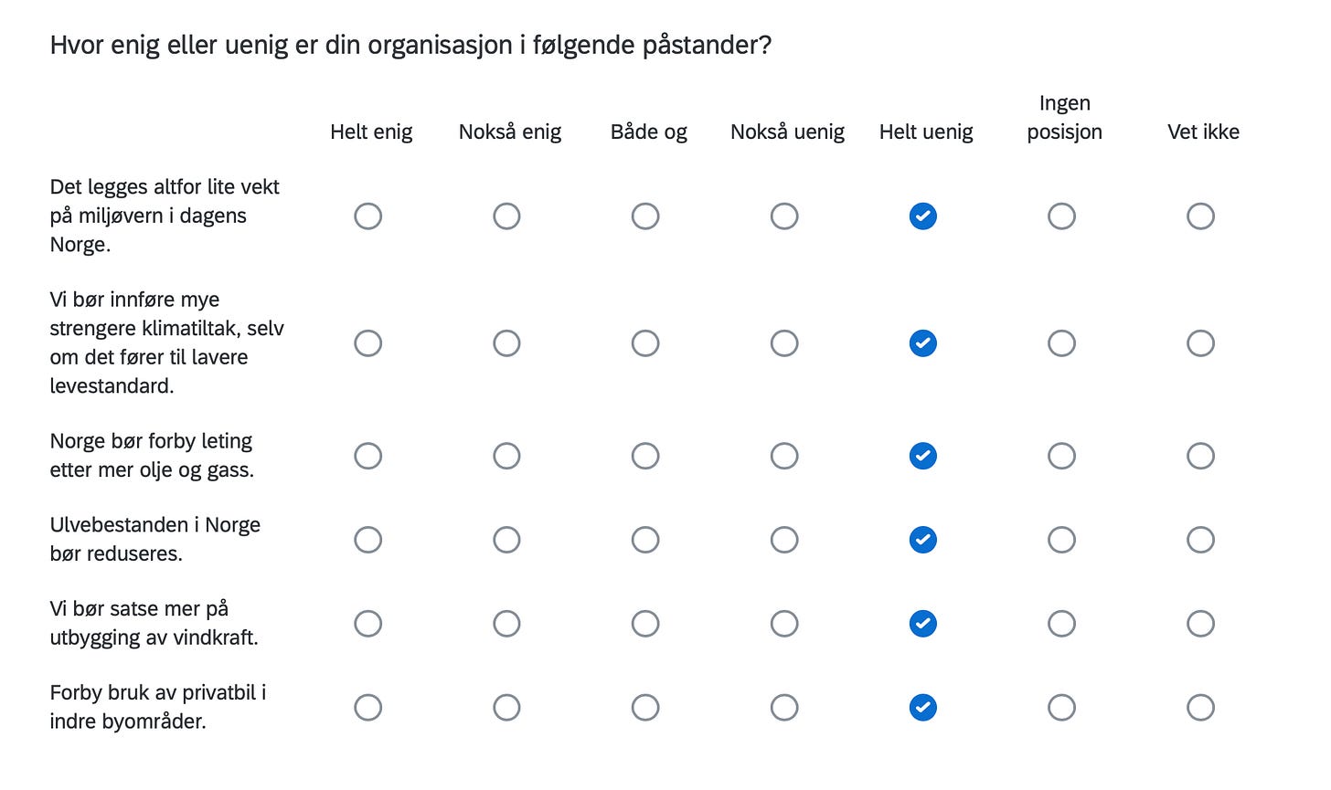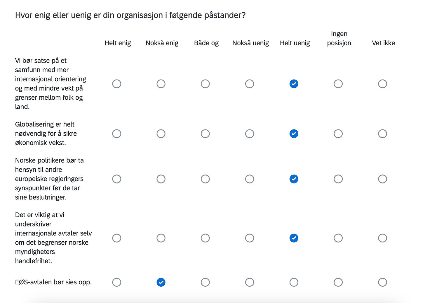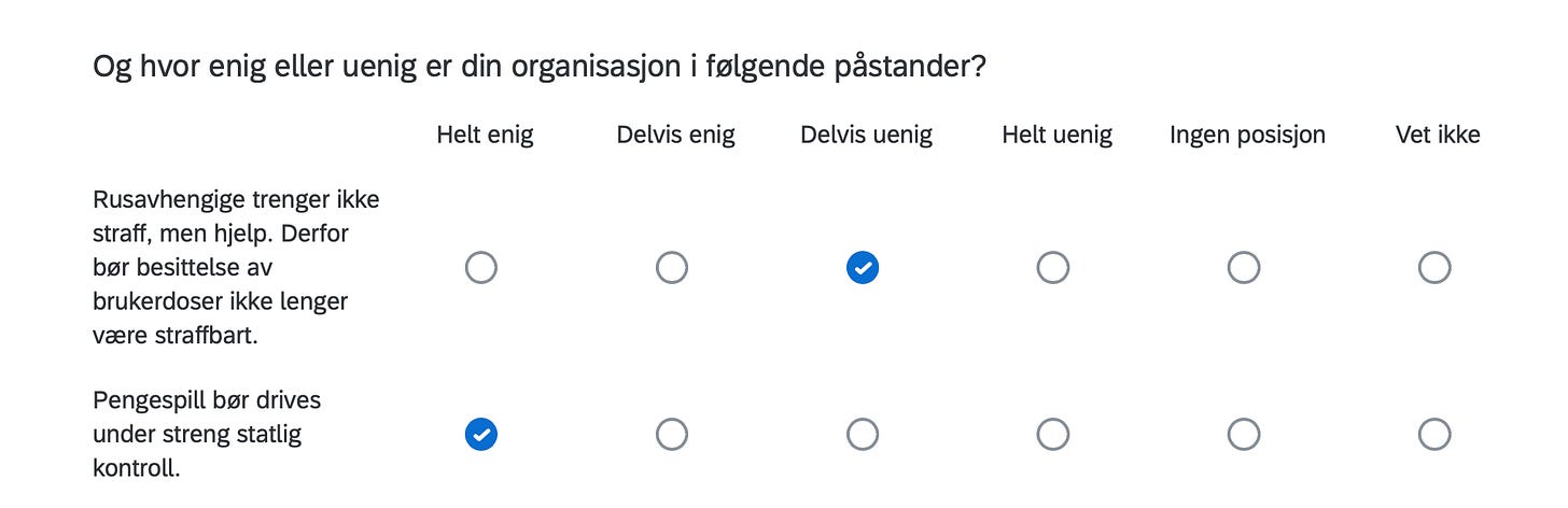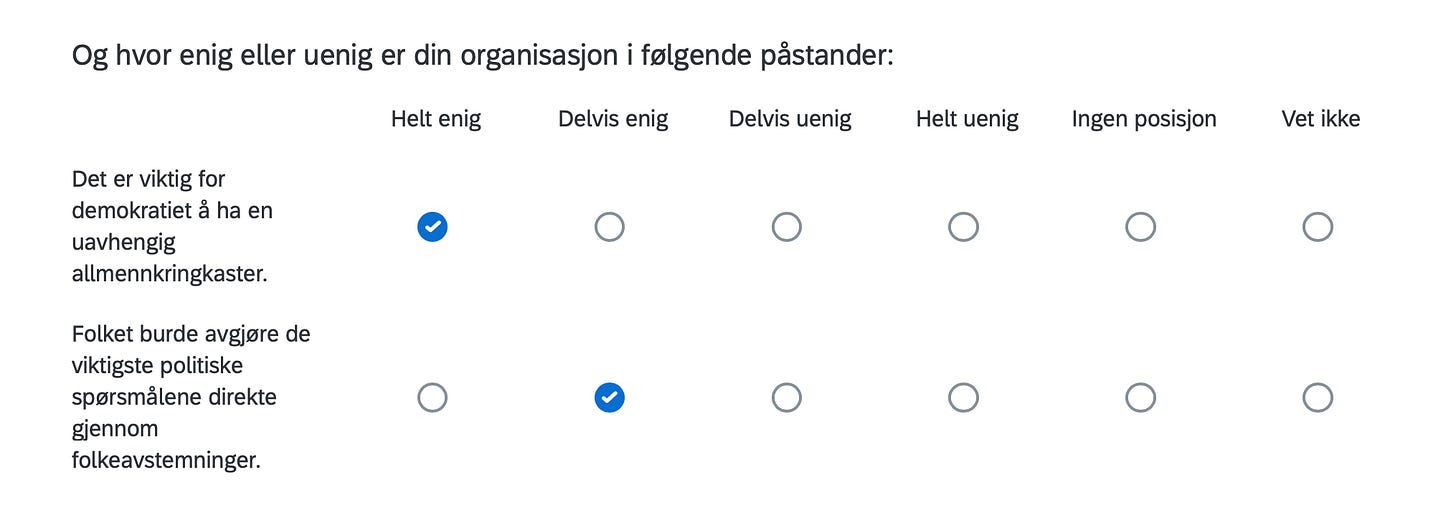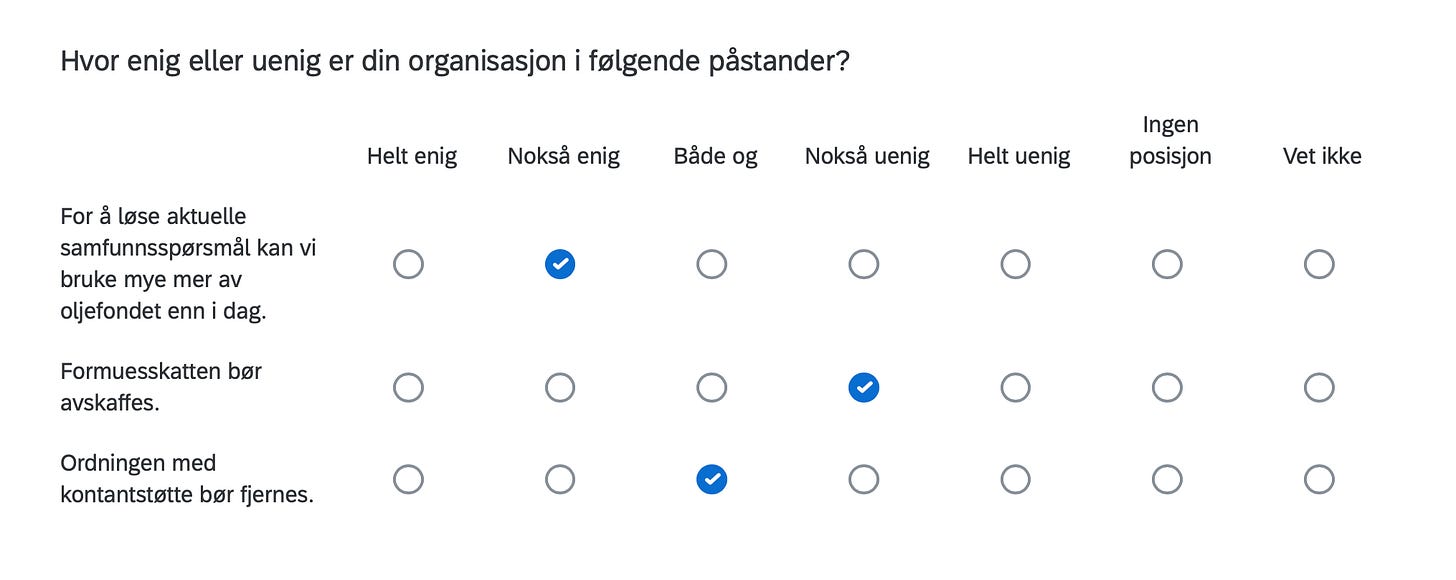 Below are the positions of FORN SIÐR in a Norwegian survey assessing the position of organizations in Norway with respect to current political issues, including controversial matters such as environment, resource extraction, immigration, NATO membership, education, gender equality and even abortion.