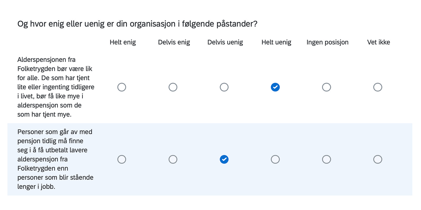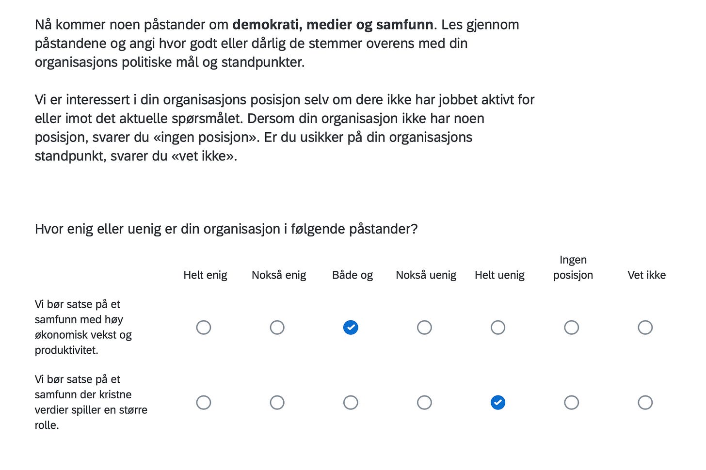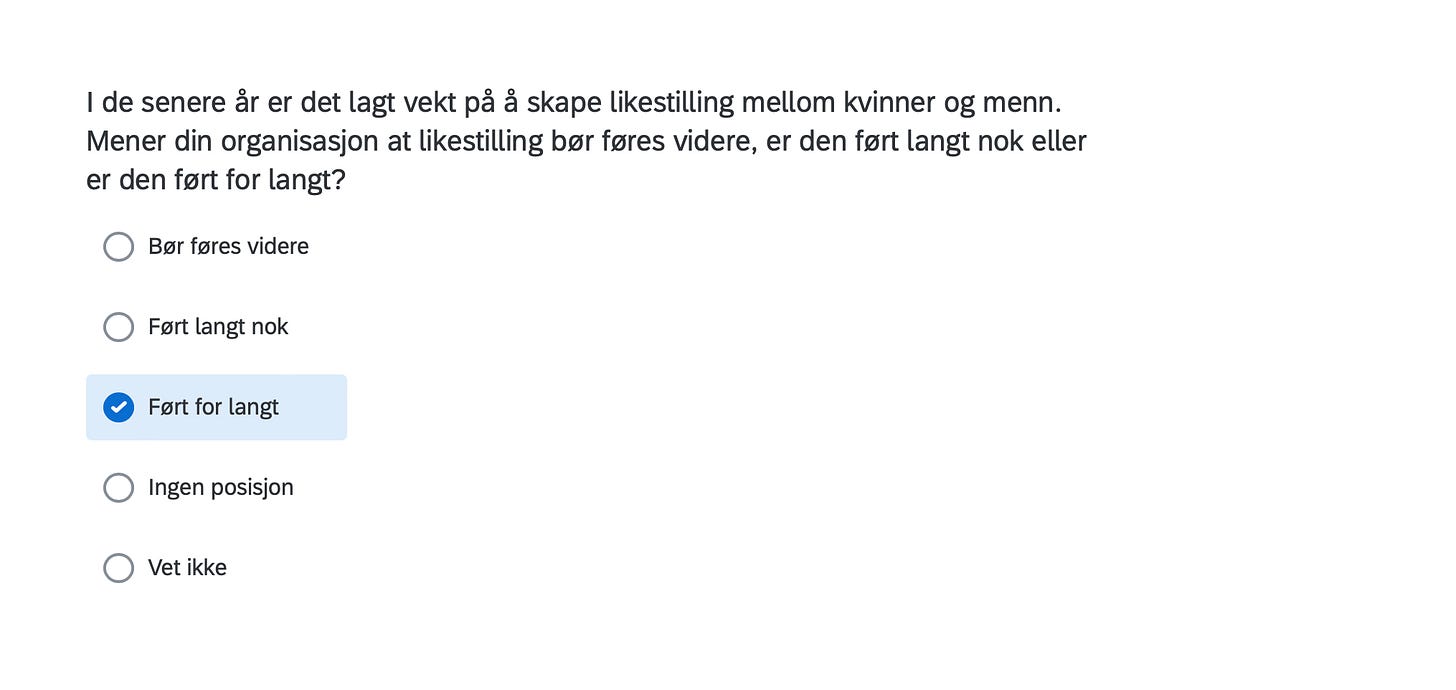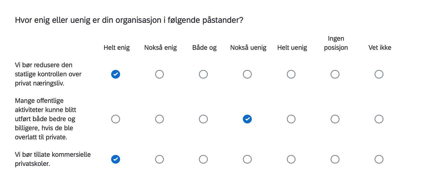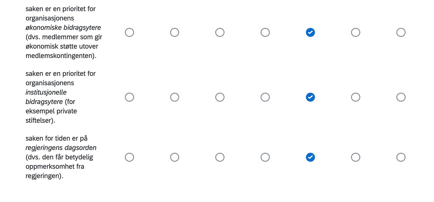 Below are the positions of FORN SIÐR in a Norwegian survey assessing the position of organizations in Norway with respect to current political issues, including controversial matters such as environment, resource extraction, immigration, NATO membership, education, gender equality and even abortion.