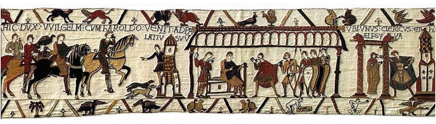The Bayeux Tapestry (230 ft long) tells the story of the events of 1064–1066 culminating in the Battle of Hastings. It only includes three women, an unknown fleeing woman, Edith, wife of Edward the Confessor and sister of King Harold, and Aelfgyva. None of these women are dressed for battle and therefore depicted as fighters, let alone warriors.
