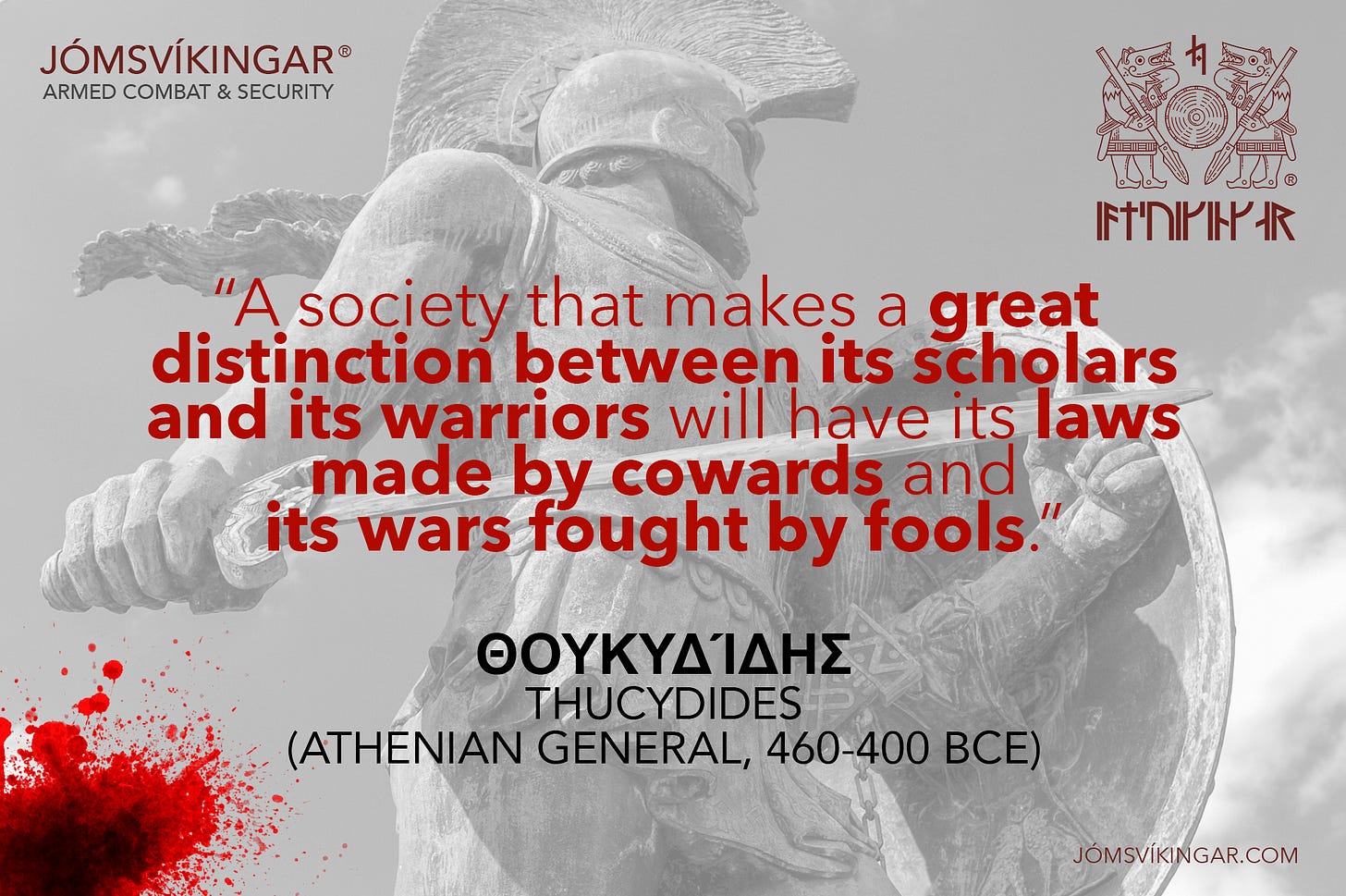 Historically, the greatest warrior societies and war bands were evolutionarily smart, and thus highly educated in relevant disciplines. This includes of course the Spartans and Jómsvíkingar. This premise ensured that there was no separation between the warriors and the law makers, because the warriors were also the law makers and ultimately controlled society.
